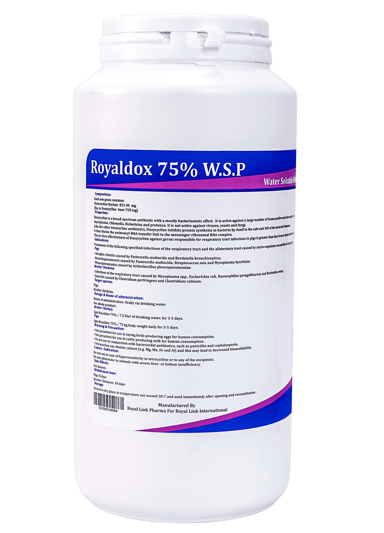 1 gm Royaldox75% W.S.P I 7.5 liter of drinking water, for 3-5 days .